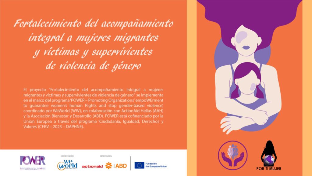 El programa POWER está cofinanciado por la Unión Europea a través del instrumento Ciudadanía, Igualdad, Derechos y Valores (CERV – 2023 – DAPHNE) y está coordinado por WeWorld, en colaboración con ActionAid Hellas y la Asociación Bienestar y Desarrollo (ABD). Su propósito es fortalecer a las Organizaciones de la Sociedad Civil en Italia, Grecia y España para proteger y promover los derechos fundamentales de las mujeres y las feminidades y para combatir de manera efectiva la violencia de género.