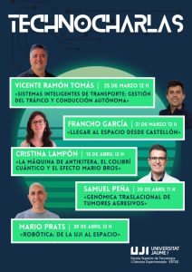 El ciclo se iniciará el 25 de marzo con la charla «Sistemas inteligentes de transporte: gestión del tráfico y conducción autónoma», a cargo de Vicente Ramón Tomás, profesor y director del Departamento de Ingeniería y Ciencia de los Computadores de la UJI y miembro del grupo de investigación Applying Intelligent Agents.